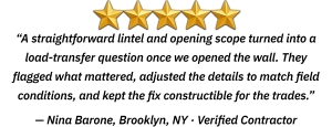 Comprehensive field verification to document existing conditions and identify apparent code-related concerns. Supports permitting, revisions, and construction coordination.